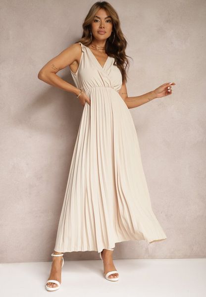 Beżowa Rozkloszowana Sukienka Plisowana z Wiskozą i Bawełną Wykończona Gumką w Talii Yefia