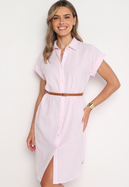 Różowa Bawełniana Sukienka Koszulowa z Krótkim Rękawem i Paskiem w Talii Nulefia