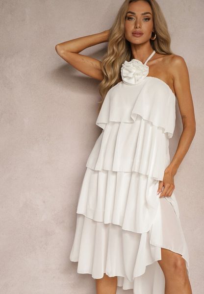 Biała Sukienka z Kwiatową Broszką Wykończona Falbanami i Wiązaniem na Szyi Tinashell