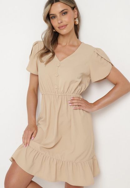 Beżowa Rozkloszowana Sukienka z Gumką w Talii i Falbanką Welimia