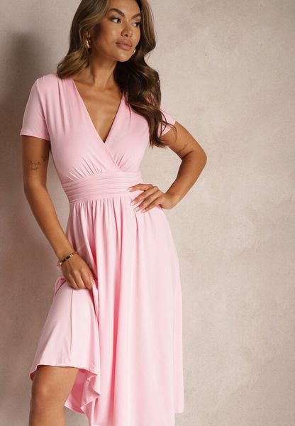 Różowa Sukienka Taliowana z Kopertowym Dekoltem o Rozkloszowanym Kroju Rimadea