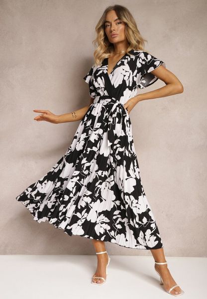 Czarno-Biała Kopertowa Plisowana Sukienka Koktajlowa z Gumką i Paskiem w Talii Benelsea