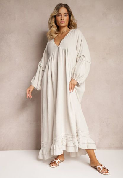 Beżowa Muślinowa Trapezowa Sukienka z Bawełny Wykończona Falbaną i Ozdobnymi Rękawami Tanisea