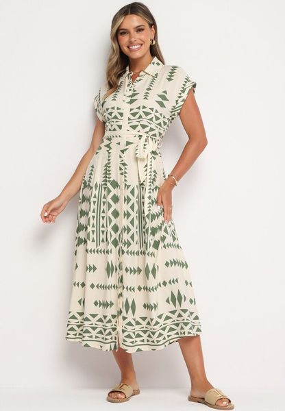 Beżowo-Zielona Wiskozowa Sukienka o Taliowanym Kroju Zapinana na Guziki z Paskiem Nasariah