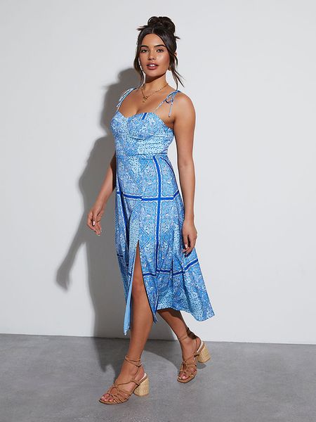 – ramiączka: wąskie- dekolt: serce- zapięcie: wiązanie- partia pleców: marszczona- dolny brzeg: 7/8, z rozcięciem- krój: taliowany- wzór: na całości