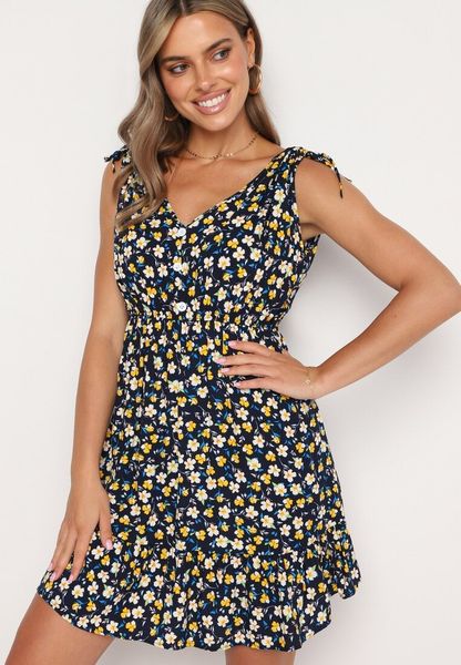 Granatowa Rozkloszowana Bawełniana Sukienka w Kwiaty z Gumką w Pasie Evieles