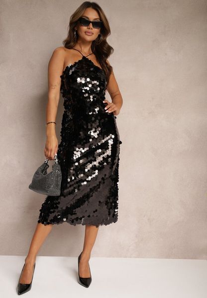 Czarna Cekinowa Sukienka o Asymetrycznym Fasonie z Ozdobnym Wiązaniem na Plecach Leriseli