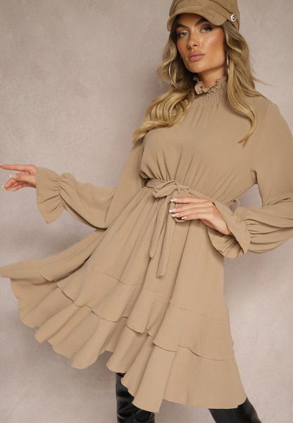 Ciemnobeżowa Sukienka z Falbankami i Golfem z Gumką w Talii i Dodatkowym Wiązanym Paskiem Savire