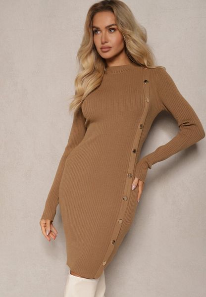 Ciemnobeżowa Prążkowana Sukienka Sweterkowa z Półgolfem ze Złotymi Guzikami Viattia