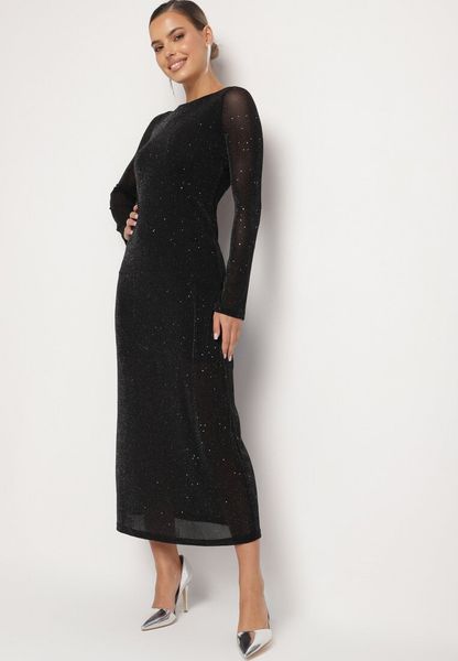 Czarna Siateczkowa Sukienka z Odkrytymi Plecami Metaliczną Nicią Wiązana na Szyi Nominia
