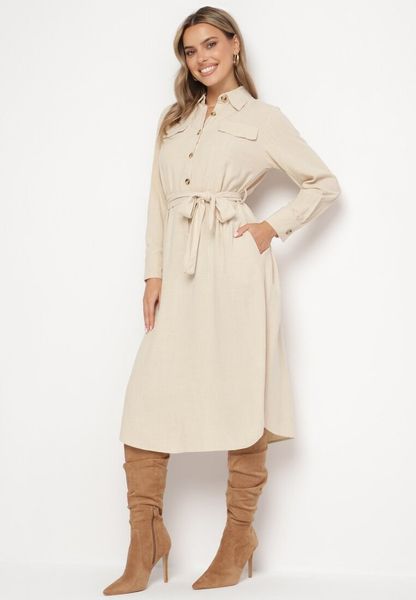 Beżowa Bawełniana Sukienka Koszulowa z Wiązanym Paskiem Zintrona
