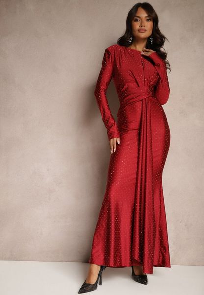 Bordowa Dopasowana Sukienka Koktajlowa Marszczona w Pasie Zdobiona Cyrkoniami Rissanea