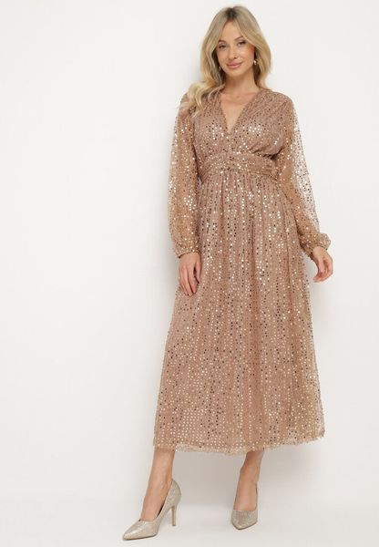 Złota Sukienka Siateczkowa o Kopertowym Kroju Zdobiona Cekinami Boniga