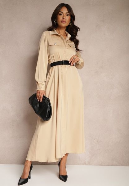Beżowa Satynowa Sukienka w Stylu Szmizjerki z Imitacjami Kieszeni i Paskiem Vaminay