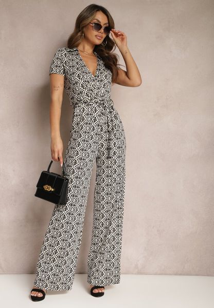 Czarno-Biały Mozaikowy Kombinezon z Trójkątnym Dekoltem i Prostymi Nogawkami Nisseria