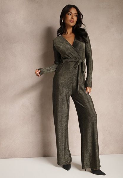 Złoty Kopertowy Kombinezon z Wiskozą z Paskiem Przeszyty Metaliczną Nicią Heladi