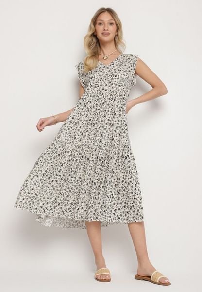 Beżowo-Granatowa Bawełniana Sukienka o Rozkloszowanym Kroju z Falbanami i Dekoltem w Serek Ifforine