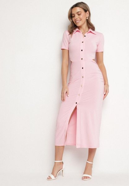 Różowa Sukienka Koszulowa z Wycięciami w Talii i i Marszczeniami Zapinana na Guziki Quvlea