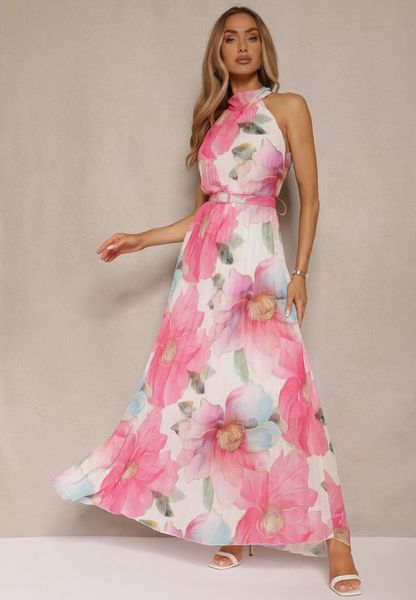 Różowa Plisowana Sukienka z Wiązaniem i Paskiem z Klamrą Nitolia