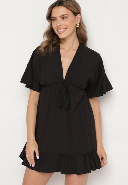 Czarna Nietoperzowa Sukienka z Wiskozą o Rozkloszowanym Kroju z Falbanką Tullimi