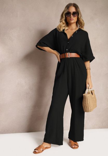 Czarny Taliowany Kombinezon z Bawełny Góra w Formie Koszuli oraz Luźne Spodnie Namsorin