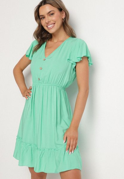 Zielona Rozkloszowana Bawełniana Sukienka z Guzikami i Falbanami Natinema