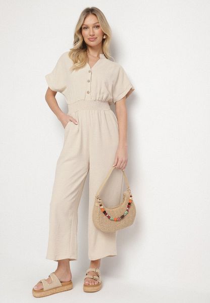 Beżowy Kombinezon z Wiskozy z Gumką w Talii i Dekoltem w Serek z Guzikami Nisella