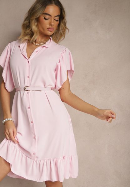 Różowa Koszulowa Sukienka Ozdobiona Falbankami i Guzikami Tenelora