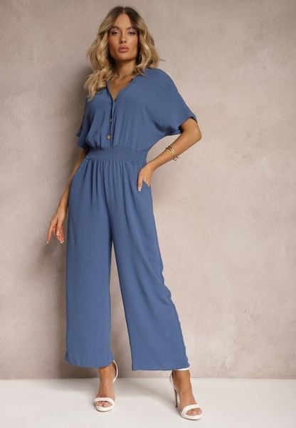 Granatowy Taliowany Kombinezon z Wiskozy Zapinany na Guziki Frisea
