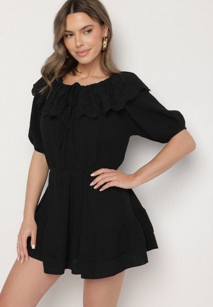 Czarna Bawełniana Sukienka z Ażurową Falbaną i Wiązaniem Univelle
