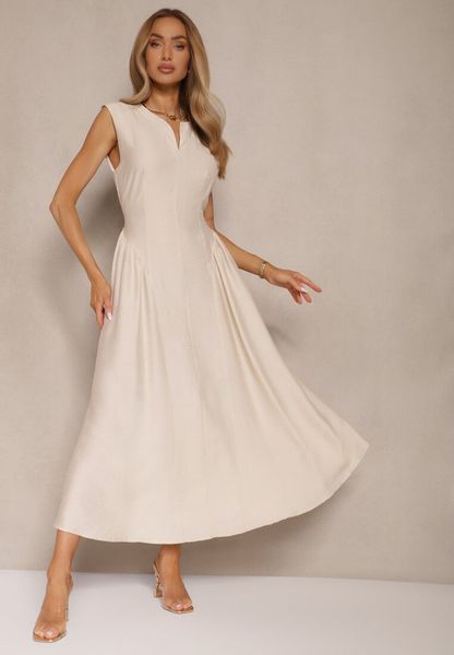 Beżowa Rozkloszowana Sukienka z Wiskozy Lirune