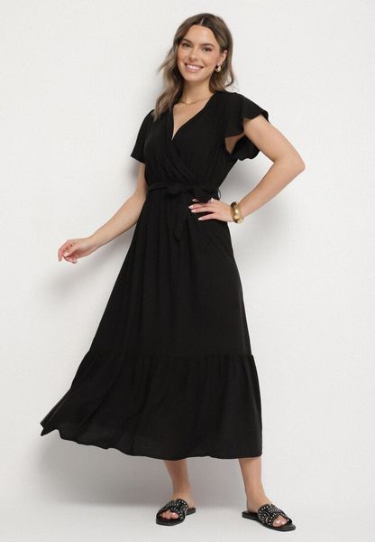 Czarna Wiskozowa Sukienka z Kopertowym Dekoltem z Paskiem Savorlisse
