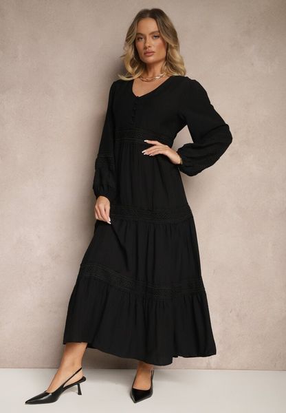 Czarna Rozkloszowana Sukienka z Wiskozy Zdobiona Koronkowymi Wstawkami Gonolen