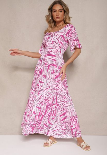 Różowa Sukienka z Bawełny o Rozkloszowanym Kroju z Motywem Liści Aluielle