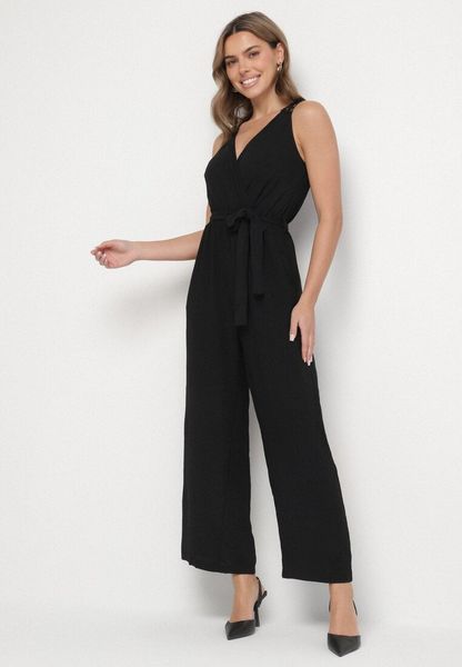 Czarny Kopertowy Kombinezon z Ażurowym Tyłem i Szerokimi Nogawkami Marilna
