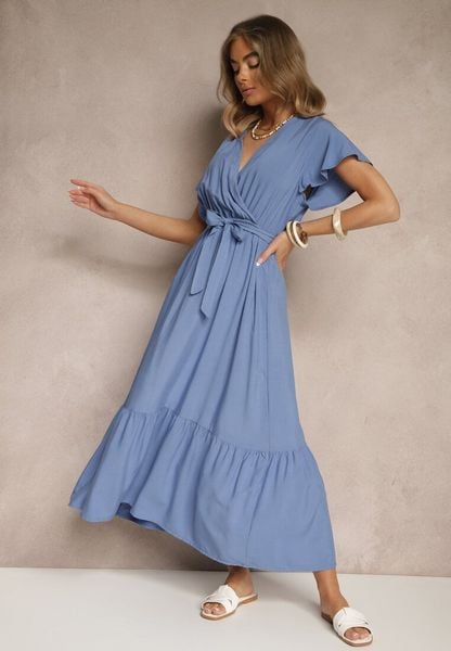 Niebieska Kopertowa Sukienka z Wiskozy Ozdobiona Paskiem Savioneira