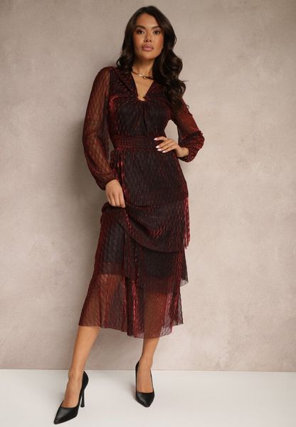 Bordowa Koktajlowa Sukienka o Rozkloszowanym Kroju z Falbankami i Metaliczną Nicią Xotarvia