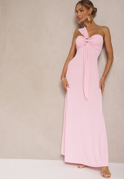 Różowa Asymetryczna Sukienka Koktajlowa Ozdobiona Metaliczną Aplikacją Divianis