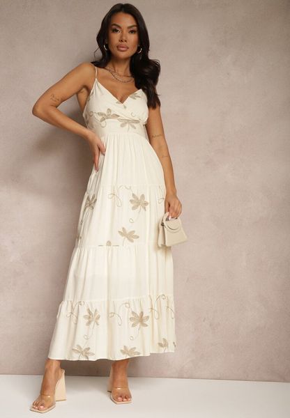Jasnobeżowa Rozkloszowana Sukienka z Wiskozy z Haftowanym Motywem na Ramiączkach Telilia