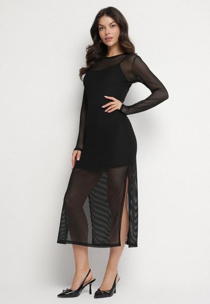 Czarna Sukienka Siateczkowa w Prążki z Wiskozą Niniria