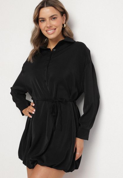 Czarna Sukienka Bombka o Koszulowym Kroju z Wiązaniem w Talii Voinna