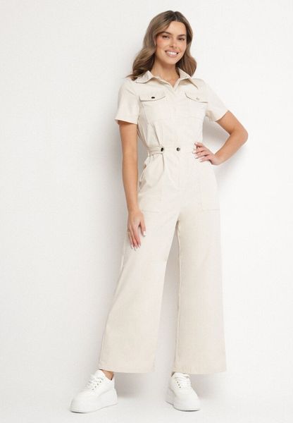 Beżowy Kombinezon na Krótki Rękaw z Kołnierzykiem i Szeroką Nogawką Jenanisela