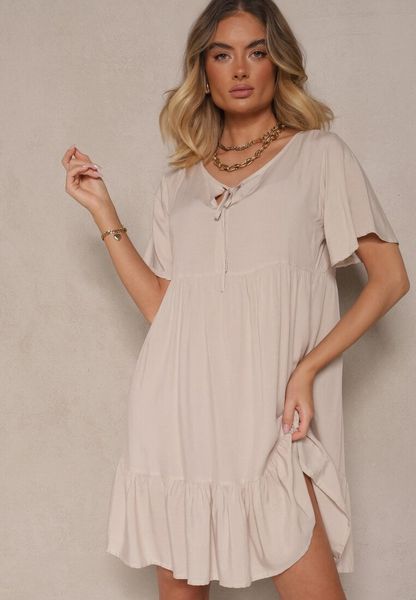 Jasnobeżowa Bawełniana Sukienka Rozkloszowana z Wiązaniem przy Dekolcie Mepova