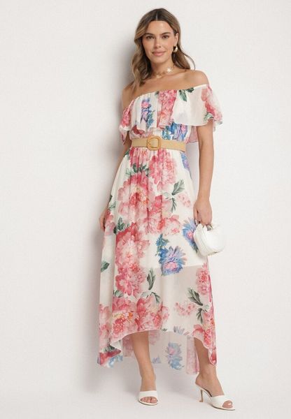 Różowa Sukienka Typu Hiszpanka w Kwiaty z Paskiem Sademire