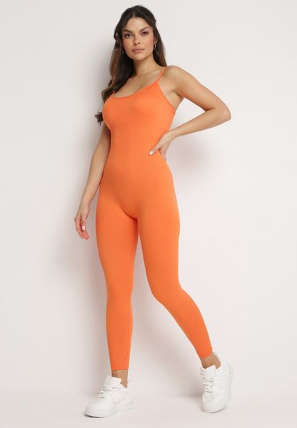 Pomarańczowy Elastyczny Kombinezon Dopasowany Bodycon na Cienkich Regulowanych Ramiączkach Xantella