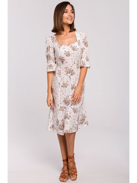 – dekolt: serce- długość rękawa: półdługi- krój rękawów: rozszerzany do dołu- detale: ozdobne guziki- krój: taliowany- wzór: kwiatowy