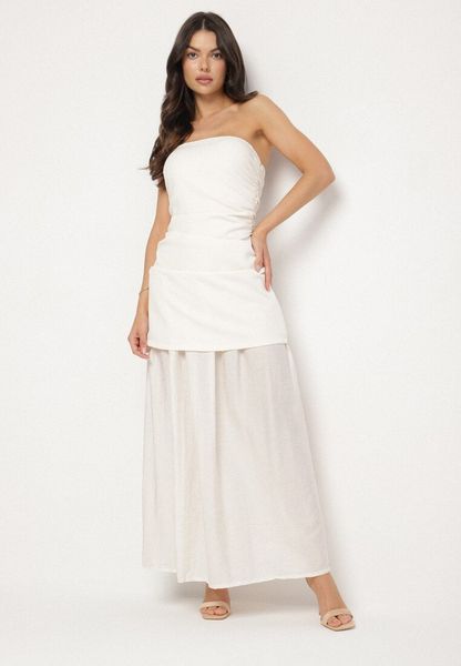 Beżowa Koktajlowa Sukienka Typu Bandeau z Marszczeniem Izelessa