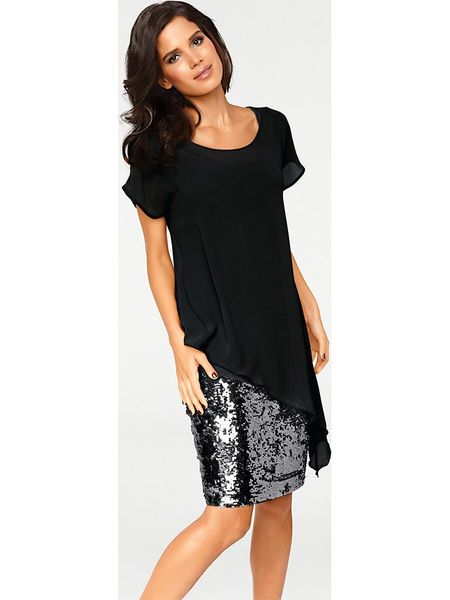 – dekolt: okrągły- detale: cekiny- krój: prosty- look: jednokolorowy, warstwy