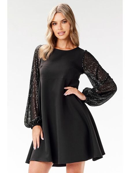 – dekolt: okrągły- rękaw: bufiasty- zakończenie rękawów: elastyczne- detale: cekiny- krój: rozkloszowany- look: jednokolorowy