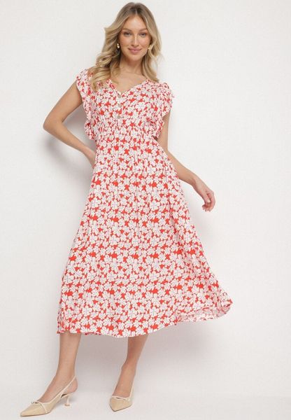 Czerwona Bawełniana Sukienka w Kwiatki o Rozkloszowanym Kroju z Gumką Alanilia